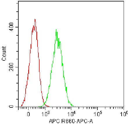 • Staining of normal human peripheral blood cells red blood cell-lysed using ammonium chloride lysis buffer using AF647 Human CEACAM-1/CD66a Antibody (Clone: 283340) (Product No.: H2187) (Green, Red: Blank Control). Analyzed data are derived from granulocytes.