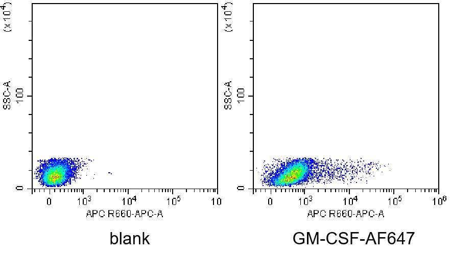 • Staining of normal human peripheral blood mononuclear cells (PBMCs) stimulated with Cell Activation Cocktail (with Brefeldin A) for 3 days and fixed/permeabilized using AF647 Human GM-CSF Antibody (Clone: BVD2-21C11) (Selleck Cat#: H1902) (Right panel, Left panel: Permeabilized Blank Control). Analyzed data are derived from lymphocytes.