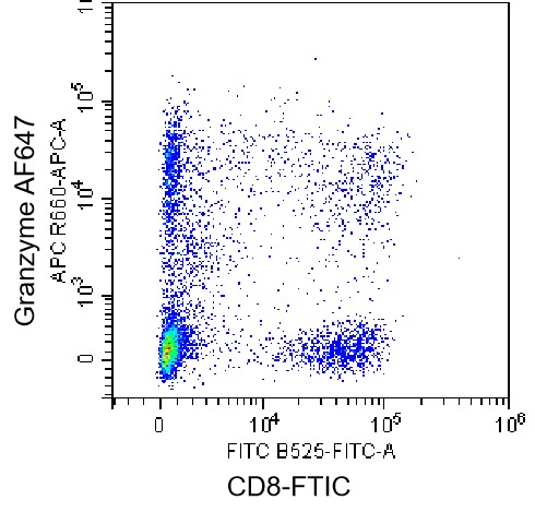 • Surface staining of normal human peripheral blood mononuclear cells (PBMCs) using FITC CD8 Antibody, washed, then fixed/permeabilized, followed by intracellular staining using AF647 Human Granzyme A Antibody (Clone: CB9) (Selleck Cat#: H2082). Analyzed data are derived from cells gated on lymphocytes.