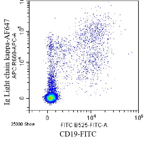 • Staining of normal human peripheral blood mononuclear cells (PBMCs) using FITC CD19 Antibody and AF647 Human Ig light chain κ Antibody (Clone: MHK-49) (Catalog Number: H3672). Analysis data derived from lymphocytes.