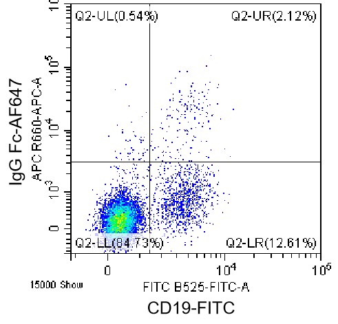 • Staining of normal human peripheral blood mononuclear cells (PBMCs) using FITC CD19 Antibody and AF647 Human IgG Fc Antibody (Clone: M1310G05) (Catalog Number: H2277). Analysis data derived from lymphocytes.