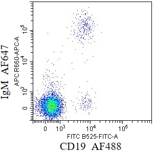 • Staining of normal human peripheral blood mononuclear cells (PBMCs) blocked with Human Fc Block using AF488 Anti-CD19 Antibody and AF647 Anti-Human IgM Antibody (Clone: MHM-88) (Product No.: H1017). Analyzed data are derived from lymphocytes.