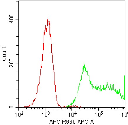 • Staining of fixed/permeabilized HEK-293F cells transfected with human IL-4 plasmid using AF647 Human IL-4 Antibody (Clone: MP4-25D2) (Product No.: H0432) (Green, Red: Blank Control). Analyzed data are derived from total cells.
