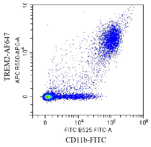 • Staining of healthy human peripheral blood mononuclear cells (PBMCs) using FITC CD11b Antibody and AF647 Human/Mouse TREM2 Antibody (Clone: FAB17291G) (Catalog Number: G3417). Analysis data derived from monocytes.