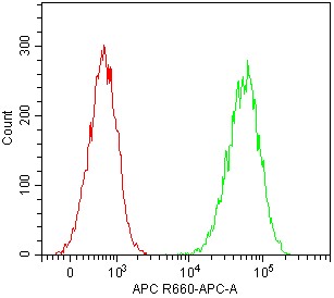 • Staining of NCCIT cell line cells using AF647 Anti-human SSEA-4 Antibody (Clone: MC813) (Product No.: H4407) (Green, red is blank cells). Analyzed data are derived from total cells.