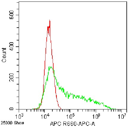 • Staining of fixed/permeabilized HEK-293F cells transfected with Human, IFN gamma cDNA ORF Clone, Flag plasmid using AF647 Anti-IFN-gamma Antibody (Clone: 4S.B3) (Product No.: H0132) (Green, Red: Blank Control). Analyzed data are derived from total cells.