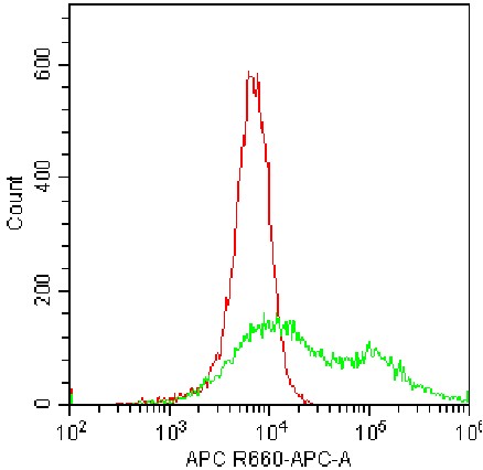 • Staining of fixed/permeabilized HEK-293F cells transfected with human IL-6 plasmid using AF647 IL-6 Antibody (Clone: MQ2-13A5) (Selleck CatNo.: G1932) (Green, Red: Blank Control). Analyzed data are derived from total cells.