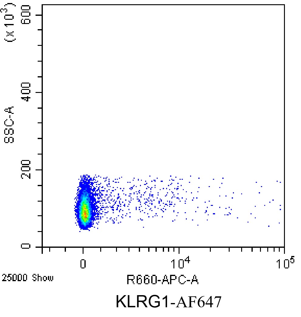 • Staining of C57BL/6 spleen using AF647 KLRG1 Antibody (Clone: 2F1) (Product No.: G3222). Analyzed data are derived from live total cells.