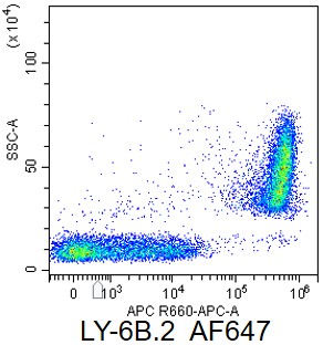 • Staining of bone marrow cells from C57BL/6 mice using AF647 Anti-Ly-6B.2 Alloantigen Antibody (Clone: 7/4) (Product No.: G3477). Analyzed data are derived from large dispersed cells.