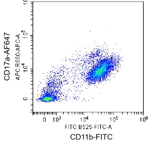 • Staining of C57BL/6 mouse bone marrow cells using FITC CD11b Antibody and AF647 Mouse CD172a/SIRPα Antibody (Clone: P84) (Catalog Number: G3012). Analysis data derived from live lymphocytes.