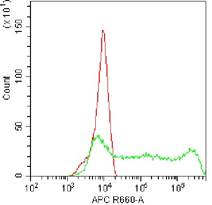 • Staining of permeabilized HEK-293F cells transfected with pLV3-CMV-Mgl2(mouse)-3×FLAG-CopGFP-Puro plasmid using fixation/permeabilization buffer with AF647 anti-mouse CD301b/MGL2 Antibody (Clone: URA-1) (Product Code: G2247) (green, red is unstained control). Analysis data derived from total cells.