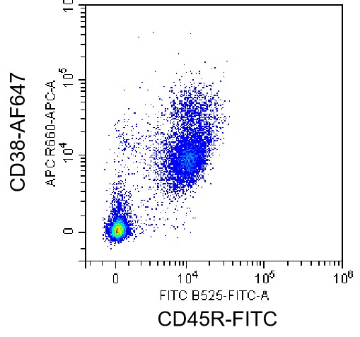 • Staining of splenic lymphocytes from C57BL/6 mice using FITC Anti-CD45R Antibody and AF647 Anti-Mouse CD38 Antibody (Clone: 90) (Product No.: G0852). Analyzed data are derived from live lymphocytes.