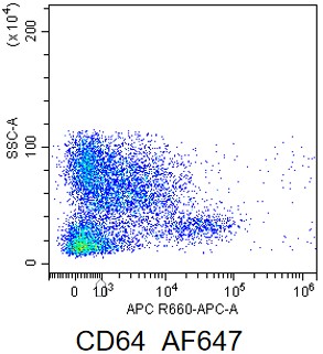 • Staining of bone marrow cells from C57BL/6 mice using AF647 Anti-Mouse CD64 Antibody (Clone: X54-5/7.1) (Product No.: G2952). Analyzed data are derived from live lymphocytes.