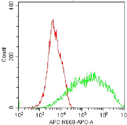• Staining of fixed/permeabilized HEK-293F cells transfected with mouse CD83 plasmid using AF647 Mouse CD83 Antibody (Clone: Michel-19) (Product No.: G1332) (Green, Red: Blank Control). Analyzed data are derived from total cells.