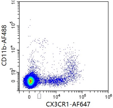 • Staining of splenic lymphocytes from C57BL/6 mice using AF488 Anti-CD11b Antibody and AF647 Anti-Mouse CX3CR1 Antibody (Clone: SA011F11) (Product No.: G1062). Analyzed data are derived from live lymphocytes.