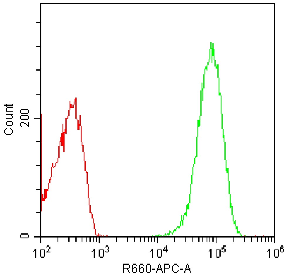 • First, fix A-431 cells with 80% methanol for 5 minutes, then permeabilize with 0.1% PBS-Triton X-100 for 15 minutes; after that, incubate cells in 1×PBS containing 10% normal goat serum to block non-specific protein interactions. Stain the treated cells using AF647 mouse/human/rat Vinculin Antibody [G6F18] (Selleck Cat.: G5172) (green, with red blank control). Analyzed data are derived from total cells.