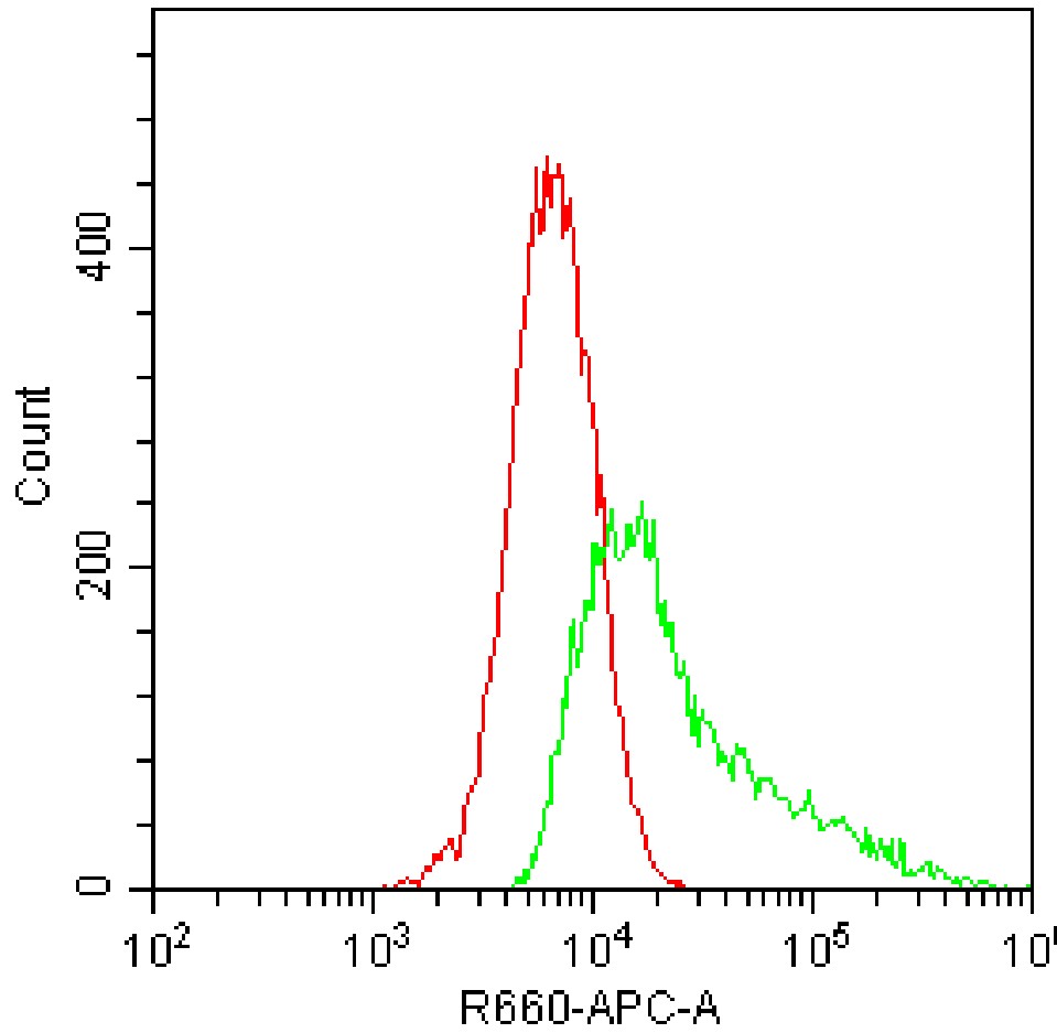 • Staining HEK-293F cells transfected with pCMV-Il2rb(mouse)-3×FLAG-Neo plasmid and fixed/permeabilized with fixation/permeabilization buffer with AF647 Mouse IL-2 Antibody (Clone: JES6-5H4) (Product Number: G1077) (green, red is unstained control). Analysis was performed on total cells.