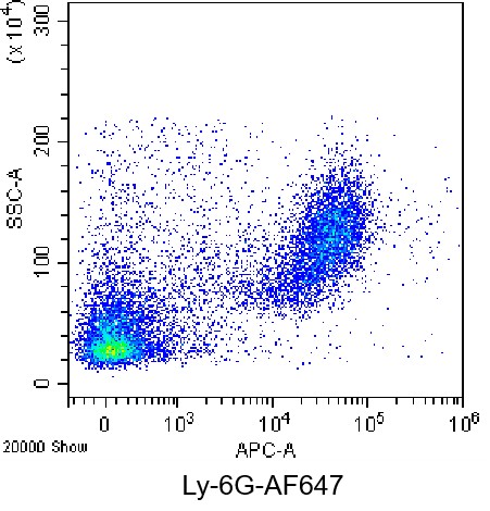 • Staining of bone marrow cells from C57BL/6 mice using AF647 Anti-Mouse Ly6G Antibody (Clone: 1A8) (Product No.: G4437). Analyzed data are derived from live lymphocytes.