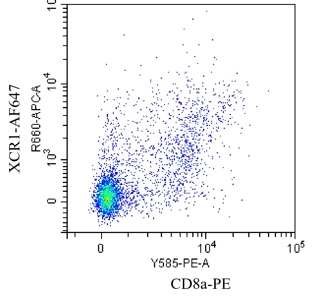 • Staining C57BL/6 mouse splenocytes digested with collagenase with AF647 Mouse/rat XCR1 Antibody (Clone: ZET) (Product Number: G3267), and PE CD8a Antibody and FITC CD11c Antibody. Analysis was performed on CD11c+ cells.