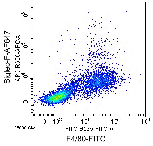 • Staining of thioglycollate-induced peritoneal cells using FITC Anti-F4/80 Antibody and AF647 Anti-Mouse Siglec-F Antibody (Clone: E50-2440) (Product No.: G0477). Analyzed data are derived from live cells.