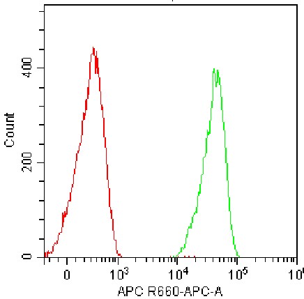 • Staining of Ramos cells stimulated with 12 µg/mL Anti-Mouse IgM for 2min, fixed with 4% paraformaldehyde and permeabilized with 90% methanol, using AF647 Phospho-Zap-70 (Tyr319)/Syk (Tyr352) Antibody (Clone: L15L21) (Product No.: G3897) (Green, Red: Blank Control). Analyzed data are derived from total cells.