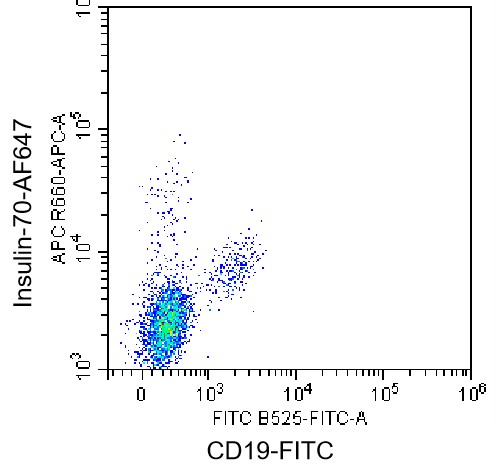 • Staining of HPBMCs cells pre-surface stained with FITC CD19 Antibody, washed, then permeabilized using Foxp3/Transcription Factor Staining Buffer Set (Permeabilization Buffer) (Product No: 00-5523-00) using AF647 PU.1 Antibody (Clone: B4N6) (Selleck Cat#: G3807). Analyzed data are derived from total cells.