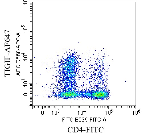 • Staining of normal human peripheral blood mononuclear cells (PBMCs) using AF647 TIGIT Antibody (Clone: MBSA43) (Selleck Cat#: H1317) and FITC CD4 Antibody. Analyzed data are derived from lymphocytes.