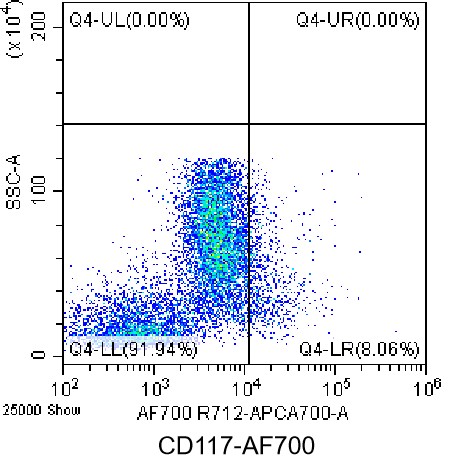 • Staining of bone marrow cells from C57BL/6 mice using AF700 Anti-CD117/c-Kit Antibody (Clone: 2B8) (Product No.: G4057). Analyzed data are derived from total live cells.