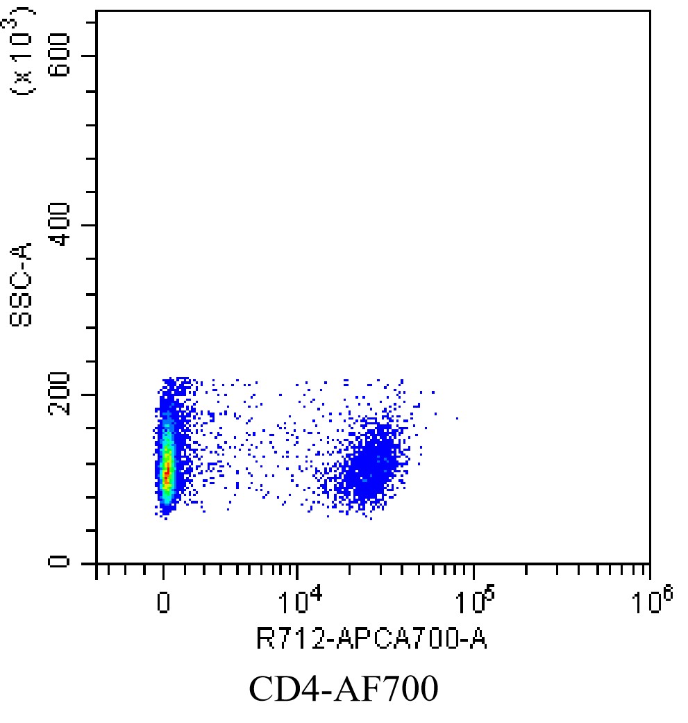 • Staining of C57BL/6 spleen using AF700 CD4 Antibody (Clone: RM4-5) (Selleck Cat.: G4942). Analyzed data are derived from live total cells.