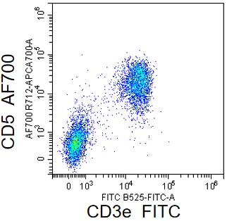 • Staining of splenic lymphocytes from C57BL/6 mice using FITC Anti-CD3e Antibody and AF700 Anti-CD5 Antibody (Clone: 53-7.3) (Product No.: G3487). Analyzed data are derived from total live cells.