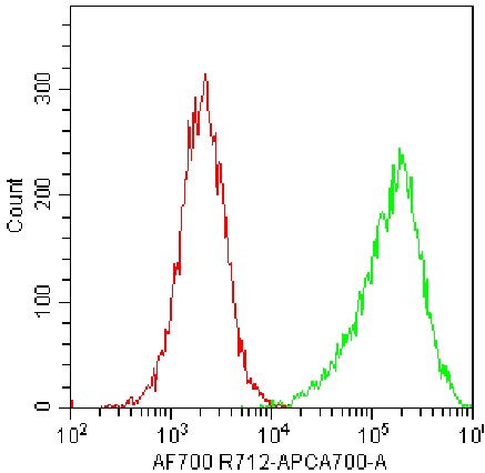 • Staining of J774A.1 cell line cells using AF700 F4/80 Antibody (Clone: BM8) (Product No.: G0067) (Green, Red: Blank Control). Analyzed data are derived from total live cells.