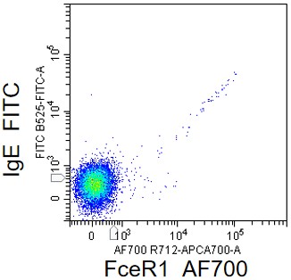 • Staining of normal human peripheral blood mononuclear cells (PBMCs) using FITC Anti-IgE Antibody and AF700 Anti-FCER1A Antibody (Clone: AER-37) (Product No.: H0772). Analyzed data are derived from lymphocytes.