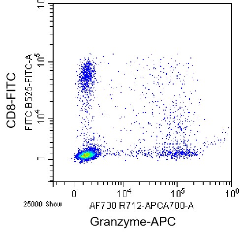 • Surface staining of normal human peripheral blood mononuclear cells (PBMCs) using FITC Anti-CD8a Antibody, washed, then fixed/permeabilized, followed by intracellular staining using AF700 Anti-Granzyme B Antibody (Clone: GB11) (Product No.: H0397). Analyzed data are derived from cells gated on lymphocytes.