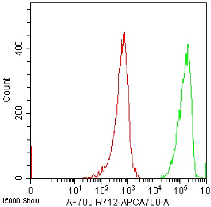 • Staining of normal human peripheral blood lysed with ammonium chloride red blood cell lysis buffer using AF700 Anti-Human CD10 Antibody (Clone: HI10a) (Product No.: H1462) (green, red is blank control). Analyzed data are derived from total live cells.