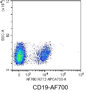 • Staining of normal human peripheral blood mononuclear cells (PBMCs) using AF700 Anti-Human CD19 Antibody (Clone: LT19) (Product No.: H0022). Analyzed data are derived from lymphocytes.