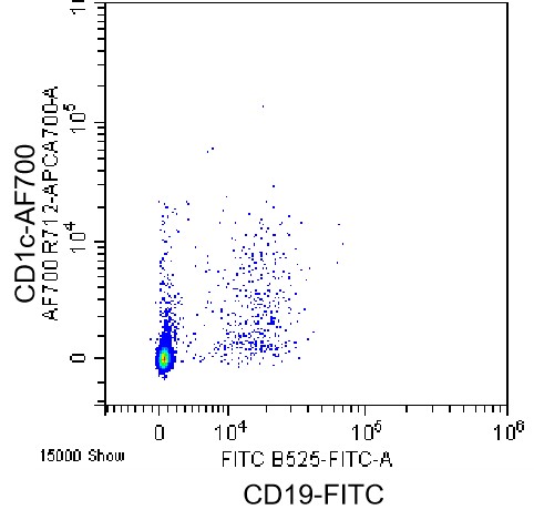 • Staining of normal human peripheral blood mononuclear cells (PBMCs) using FITC Anti-CD19 Antibody and AF700 Anti-Human CD1c Antibody (Clone: L161) (Product No.: H1597). Analyzed data are derived from lymphocytes.
