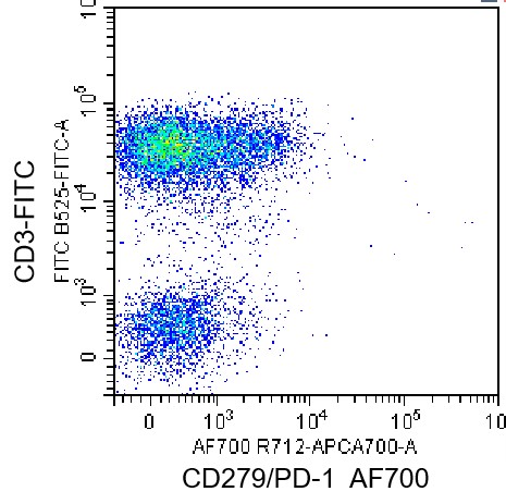 • Staining of normal human peripheral blood mononuclear cells (PBMCs) using FITC Anti-CD3 Antibody and AF700 Anti-Human CD279/PD-1 Antibody (Clone: EH12.2H7) (Product No.: H0442). Analyzed data are derived from lymphocytes.