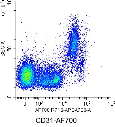 • Staining of normal human peripheral blood mononuclear cells (PBMCs) using AF700 Anti-Human CD31 Antibody (Clone: WM59) (Product No.: H0232). Analyzed data are derived from live cells.