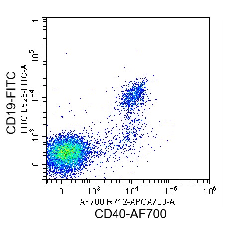 • Staining of normal human peripheral blood mononuclear cells (PBMCs) using FITC Anti-CD19 Antibody and AF700 Anti-Human CD40 Antibody (Clone: 5C3) (Product No.: H0562). Analyzed data are derived from lymphocytes.