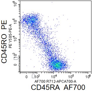 • Staining of normal human peripheral blood mononuclear cells (PBMCs) using AF700 Anti-Human CD45RA Antibody (Clone: HI100) (Product No.: H0742). Analyzed data are derived from lymphocytes.