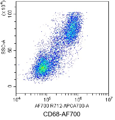 • Staining of fixed/permeabilized normal human peripheral blood mononuclear cells (PBMCs) using AF700 Anti-Human CD68 Antibody (Clone: Y1/82A) (Product No.: H0517). Analyzed data are derived from total cells.