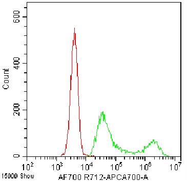 • Staining of fixed/permeabilized HEK-299F cells transfected with pCMV-CD83(human)-3×FLAG-Neo plasmid using AF700 Anti-Human CD83 Antibody (Clone: HB15e) (Product No.: H1477) (green, red is blank control). Analyzed data are derived from total cells.