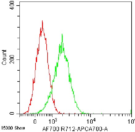 • Staining of Jurkat cell line cells using AF700 Anti-Human CD90 Antibody (Clone: 5E10) (Product No.: H0307) (red/green, red is unstained control). Analyzed data are derived from live cells.