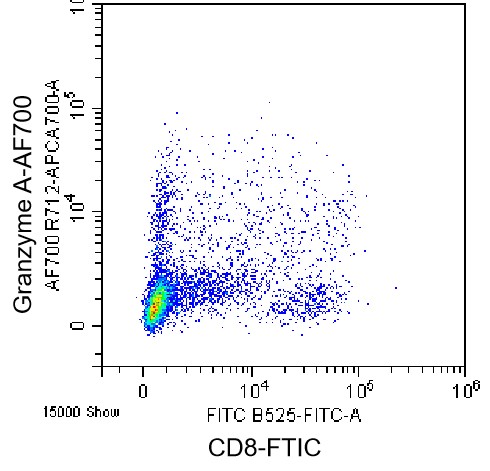 • Surface staining of normal human peripheral blood mononuclear cells (PBMCs) using FITC Anti-CD8a Antibody, followed by permeabilization using fixation/permeabilization buffer after washing, then intracellular staining using AF700 Anti-Human Granzyme A Antibody (Clone: CB9) (Product No.: H2077). Analyzed data are derived from cells in the lymphocyte gate.