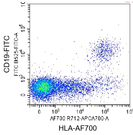 • Staining of normal human peripheral blood mononuclear cells (PBMCs) using FITC Anti-CD19 Antibody and AF700 Anti-Human HLA Antibody (Clone: G46-6) (Product No.: H0472). Analyzed data are derived from lymphocytes.