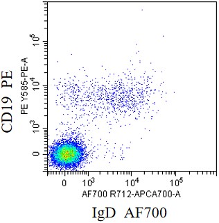 • Staining of normal human peripheral blood mononuclear cells (PBMCs) using PE Anti-CD19 Antibody and AF700 Anti-Human IgD Antibody (Clone: IA6-2) (Product No.: H3697). Analyzed data are derived from lymphocytes.