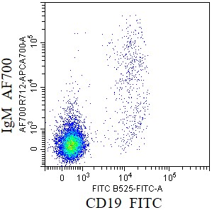 • Staining of normal human peripheral blood mononuclear cells (PBMCs) blocked with Human Fc Block using APC Anti-CD19 Antibody and AF700 Anti-Human IgM Antibody (Clone: MHM-88) (Product No.: H1012). Analyzed data are derived from lymphocytes.