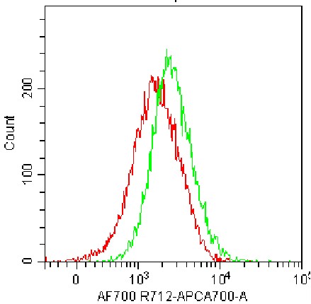 • Staining of HUVEC cell line cells using AF700 Anti-Human VEGFR2/KDR/Flk-1 Antibody (Clone: 89106) (Product No.: H0607) (Green, Red: Blank Control). Analyzed data are derived from live cells.
