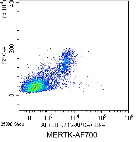 • Staining of ascites cells from C57BL/6 mice using AF700 Anti-MERTK Antibody (Clone: DS5MMER1) (Product No.: G1972). Analyzed data are derived from live lymphocytes.