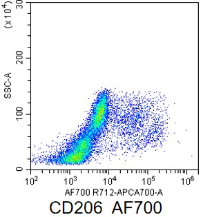 • Staining of ascites cells from C57BL/6 mice using AF700 Anti-Mouse CD206/MMR Antibody (Clone: C068C2) (Product No.: G4072). Analyzed data are derived from live cells.